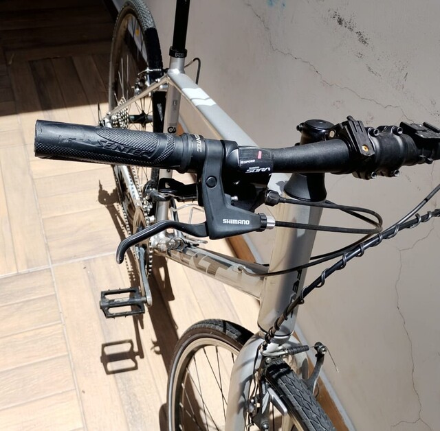 Acompanha de brinde, o grupo original da bike, o Shimano Altus/Acera 3x8.