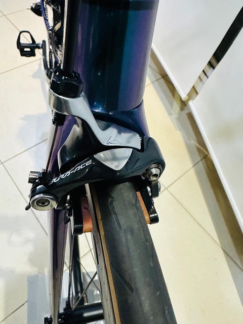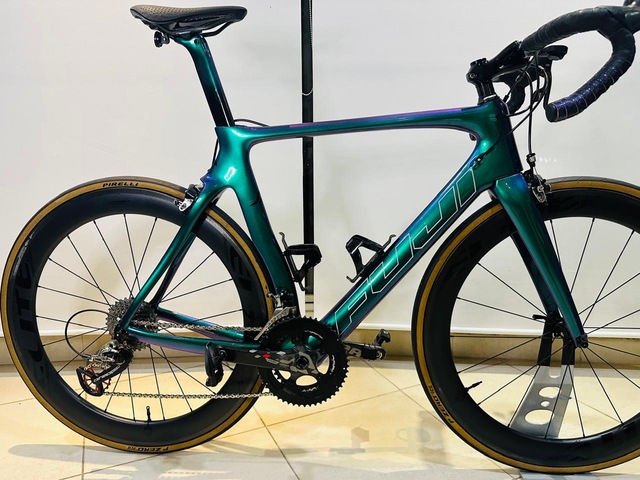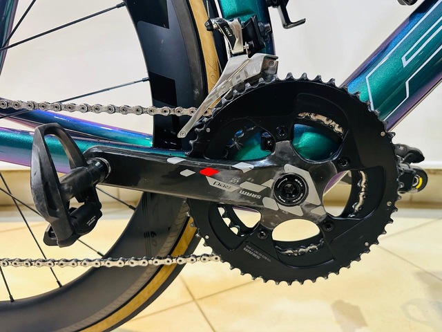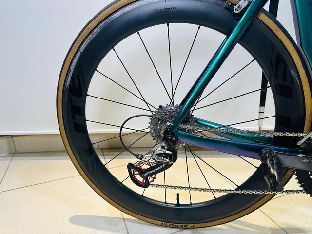 - Bike aero de alta performance, extremamente leve (≈6,9 kg com pedais) e montada com componentes topo de linha